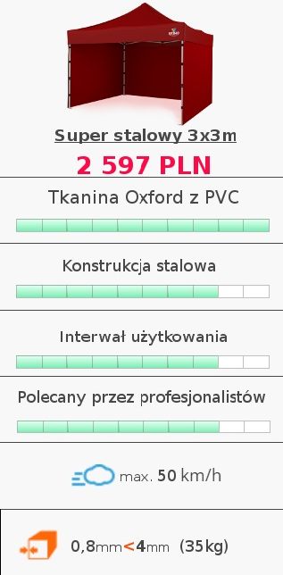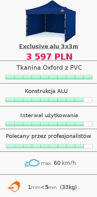 Dzięki szybkiemu rozkładaniu można przygotować imprezę w ciągu kilku minut, co jest szczególnie ważne, jeśli chcesz zaoszczędzić czas i energię. Składane altany są często wykorzystywane na targowiskach, festiwalach i innych imprezach. Ich wymiary 3x3 metry są na tyle uniwersalne, że pasują do różnych wydażeń ale także dodają profesjonalnego wyglądu Twojemu miejscuu sprzedaży lub uroczystościom. Ich wszechstronność i solidna konstrukcja czynią je idealnym rozwiązaniem dla osób poszukujących niezawodnego sposobu na organizację udanych eventów, pokazów samochodowych, wystaw i uroczystości.